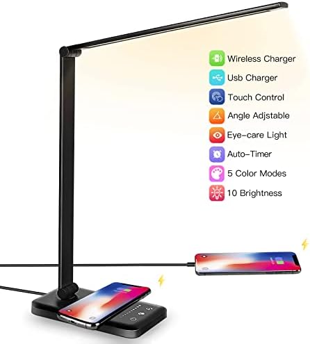 JOSTIC LED Desk Lamp with Wi-fi Charger, USB Charging Port, Desk Lighting with 10 Brightness, 5 Colour Modes, Dimmable Eye Caring Studying Desk Mild for Residence Workplace, Contact Management, Auto Timer, Black