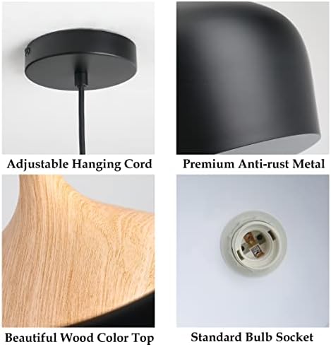 Karmiqi Fashionable Pendant Gentle with LED Bulb, Wooden Sample Metallic Shade Ceiling Hanging Gentle Fixtures for Kitchen Island, Eating Room, Residing Room, Visitor Room(Black)