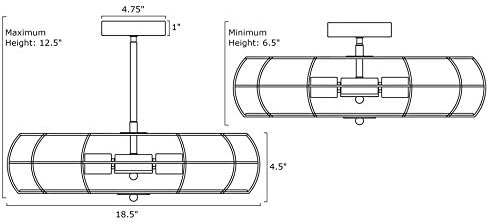 DIMENSIONS: Ceiling Mild w/ Downrod: 18.5″ (D) x 12.5″ (H), Ceiling Mild w/o Downrod: 18.5″ (D) x 6.5″ (H), Fan Fashion Cage Shade: 18.5″ (D) x 4.5″ (H), Cover: 4.75″ (D) x 1″ (H), Non-obligatory Downrod: 6″. Minimal/Most: 6.5″- 12.5″