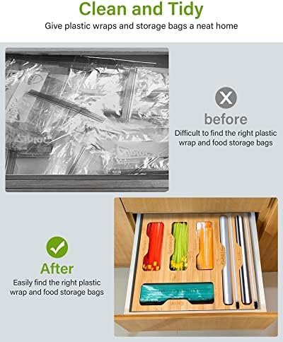 KOCWELL Bag Storage Organizer and Plastic Wrap Dispenser with Cutters 6 in 1, 2 Foil and Plastic Wrap Organizer, 4 Ziplock Bag Holder for Gallon, Quart, Sandwich Snack Selection Dimension Baggage, Bamboo
