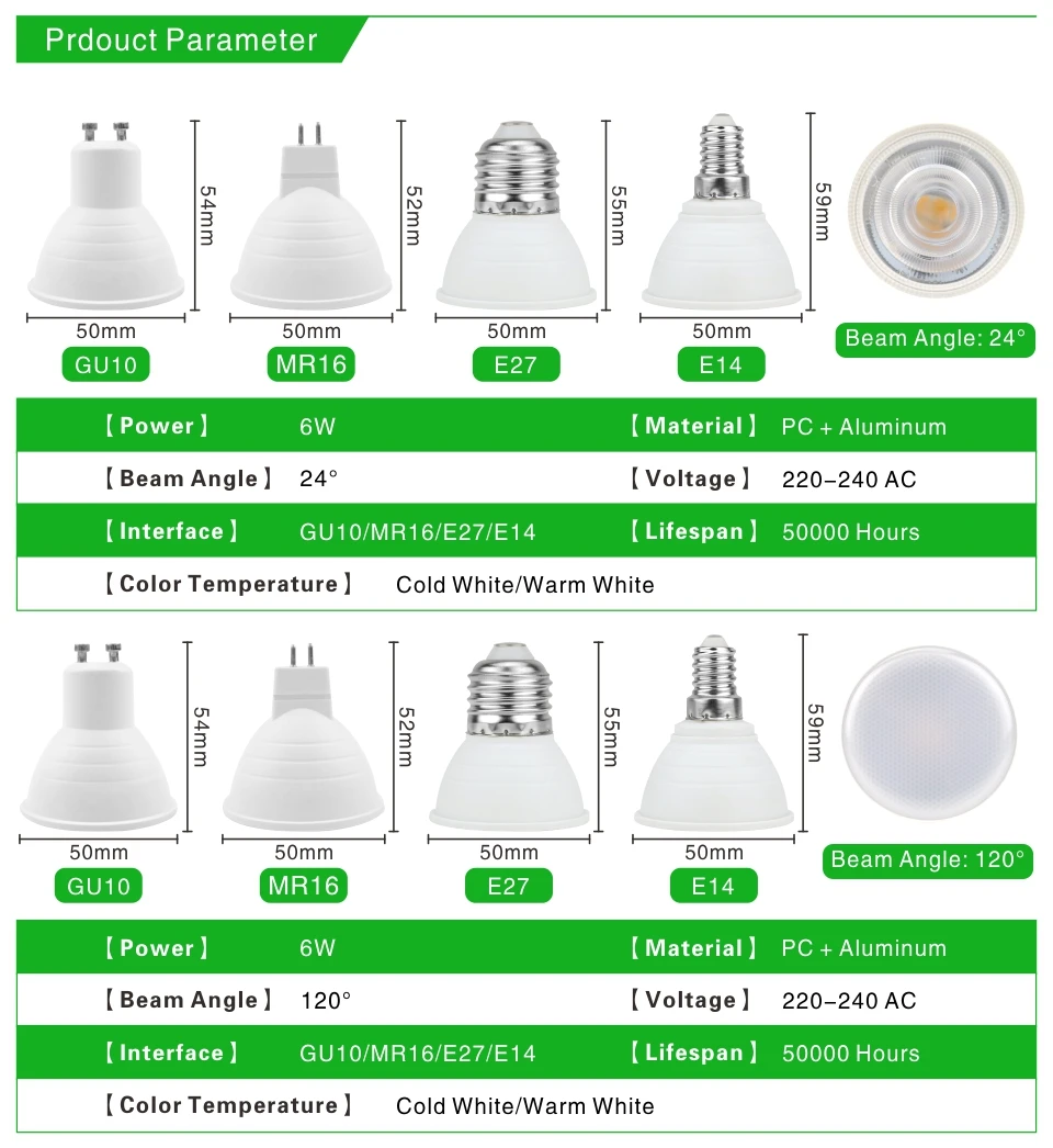 Specification: LED Bulb E27 E14 MR16 GU10 GU5.3 Lampada Led 6W 220V-240V 24/120 diploma Bombillas LED Lamp Highlight Lampara LED Spot Gentle