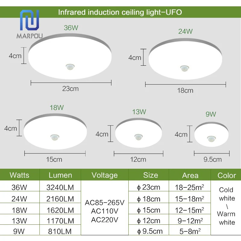 Specification: LED Ceiling Lamp PIR Movement Sensor 220V 110V 9W 13W 18W 24W 36W Heat White Chilly White Mordern Ceiling Lights For Lobby Hallways