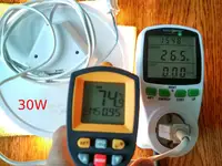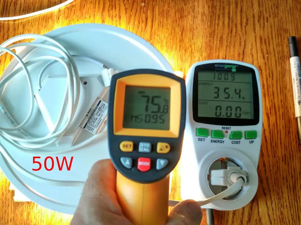 17 дней в РО с момента заказа, трек отслеживался, пришло в объединённой посылке, упаковано в воздушный матрас, внутри всё целое. Брал 3 разных(20,30,50), пришли одной посылкой(30,30,50). Потребляемая мощность и нагрев на фото. Если в драйвере убрать один резистор, температура не поднимается выше 50°С, освещённость при этом падает с 430Lux до 240Lux, расстояние 1м, лампа 30W. На глаз освещение падает не очень сильно, зато проживёт дольше. Для тех кто будет разбирать, пластиковый плафон приклеен на “термосопли”. Не мигает.