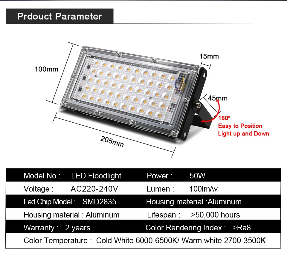 Specification: LED Flood Gentle 50W AC 220V 240V Outside Lighting Waterproof IP65 Floodlight LED Highlight Large Energy Fixture Reflector