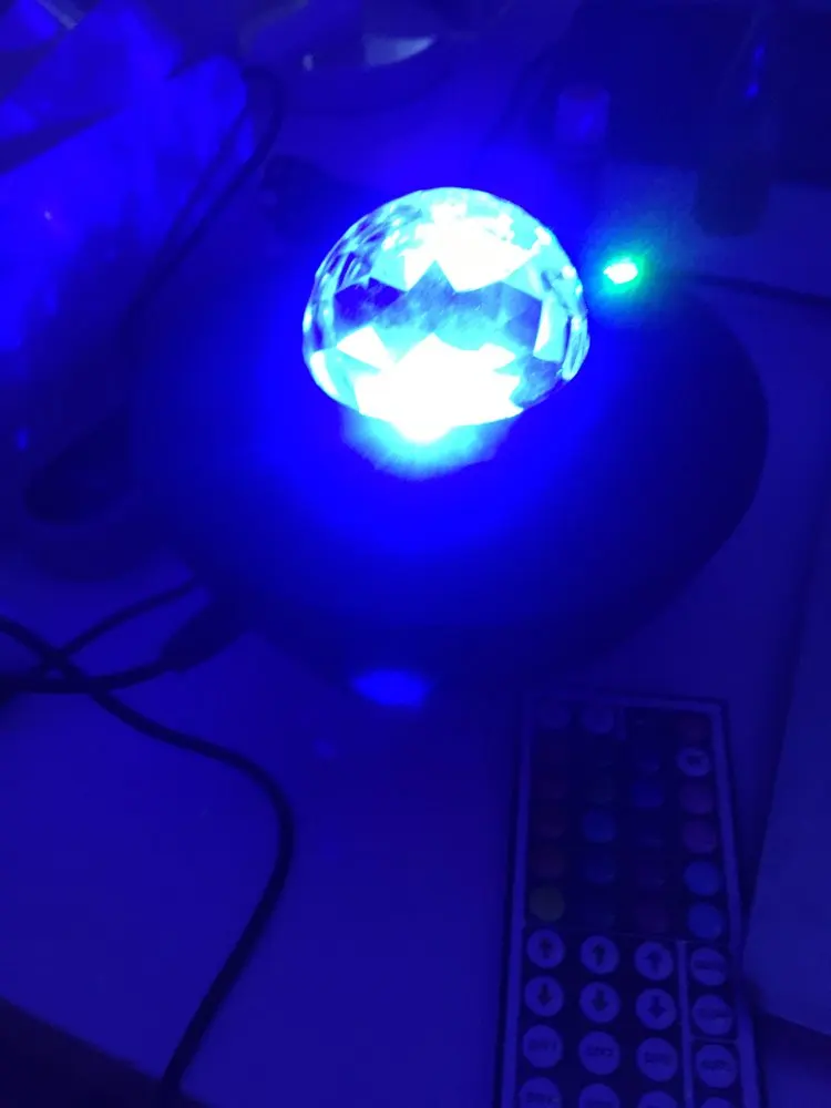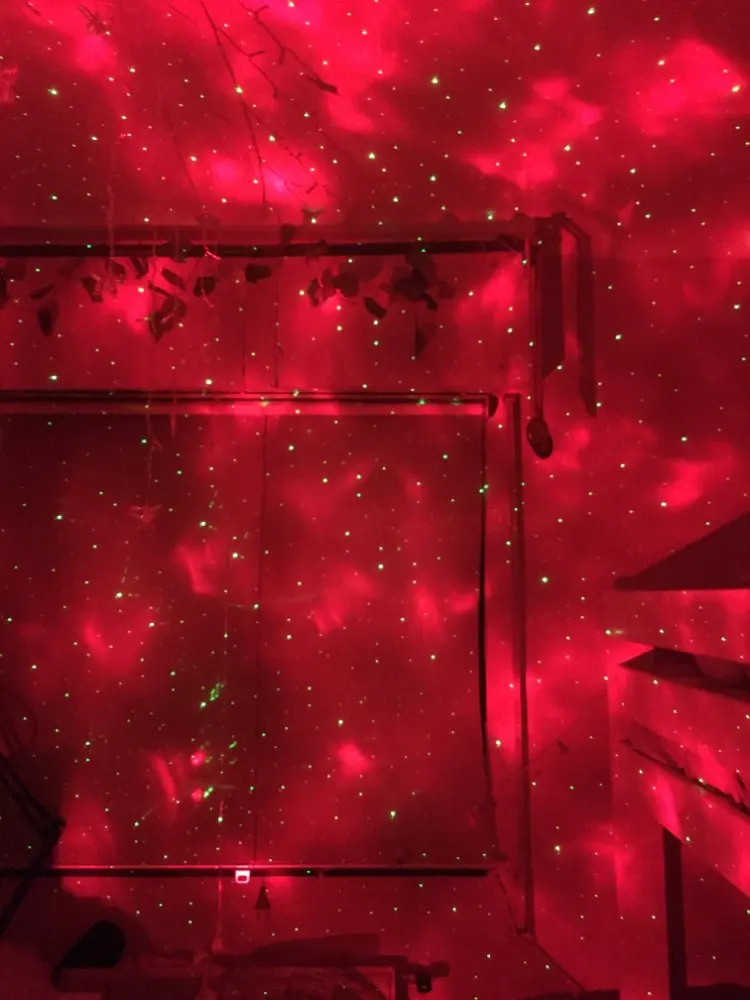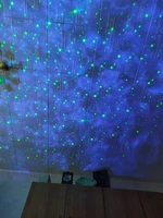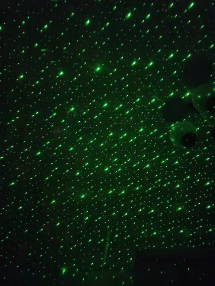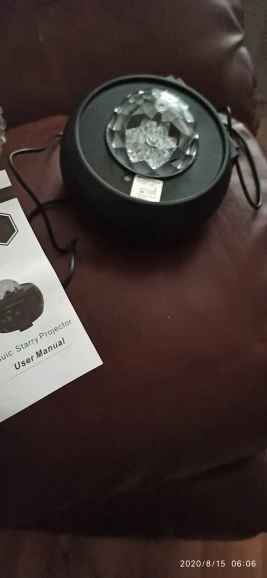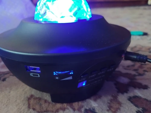 Cool projector! Lighting depends on the size of the room and the position of the projector itself, if slightly under the slope, then on the wall will be these beautiful overflows. The light is very beautiful in different modes. Pure colors: blue, green, red, white and mixed. Laser-green stars. Works from the network, you need an additional plug-adapter. Music through Bluetooth in the phone. The sound is good, like old tape recorders with discs, but for such a thing it’s quite normal!