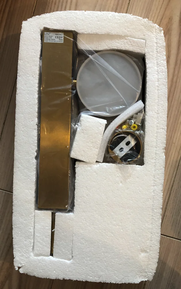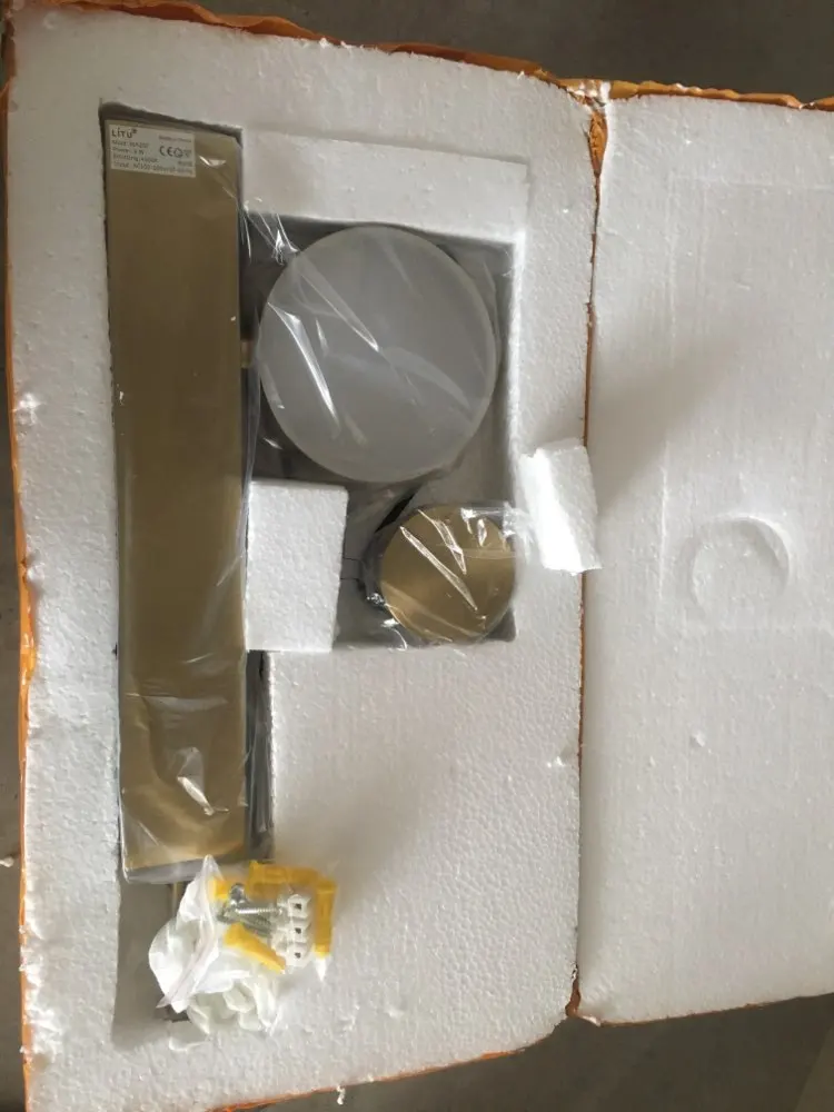 Заказ дошёл за 3 недели. Упаковано хорошо. Два отдельных заказа с одинаковыми бра объединили в один пенопласт. Не сразу догадалась, что в коробке два бра. Сверху плафонов были царапинки, явно не из-за перевозки. Продавец по спору вернул 1000р и 500р. Всё работает