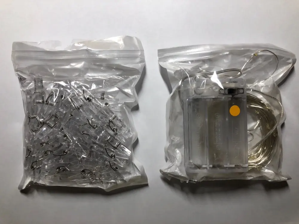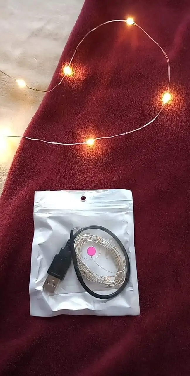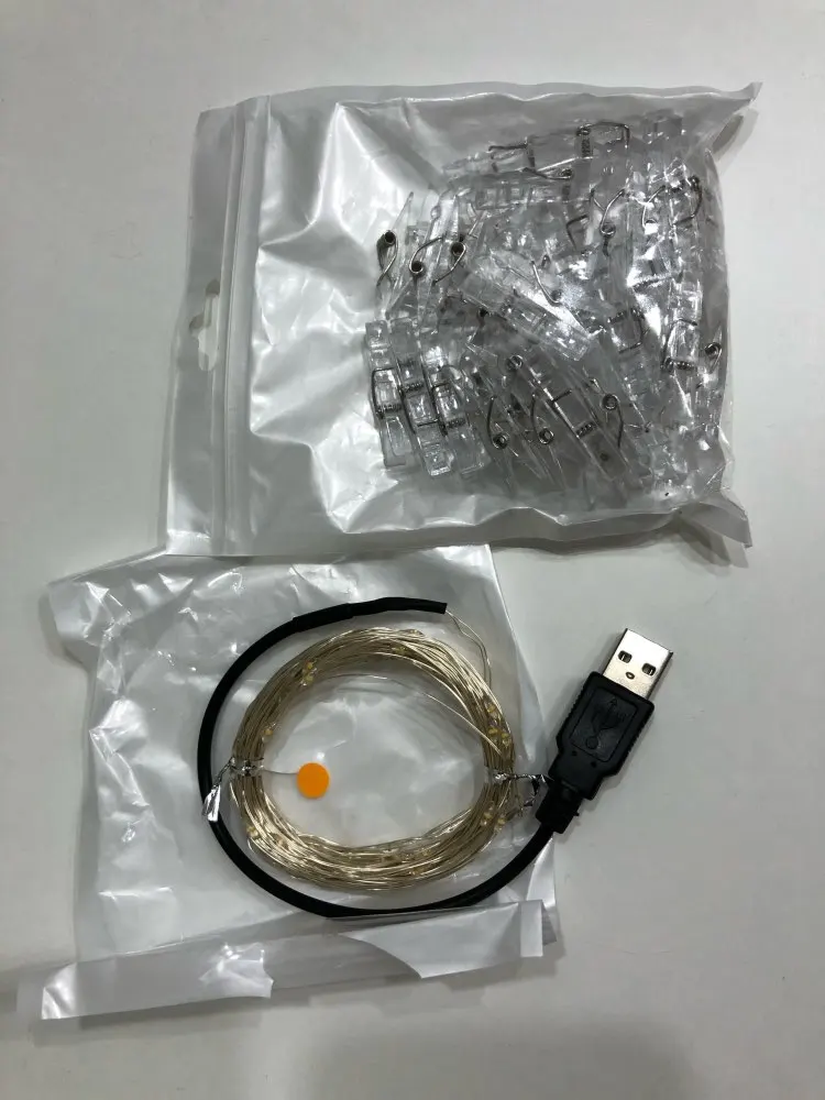 Изначально такая хрупкая конструкция не вызывала доверия, но при подключении очень понравилось 🙂 Вставить провод можно в адаптер зарядки для телефона – всё работает. Тоненькая аккуратная проволока даже добавляет изящности)) В комплекте аж 50 прищепок, одна оказалась сломанной, но вообще не беда) Спасибо большое продавцу за быструю отправку и исправность гирлянды !)