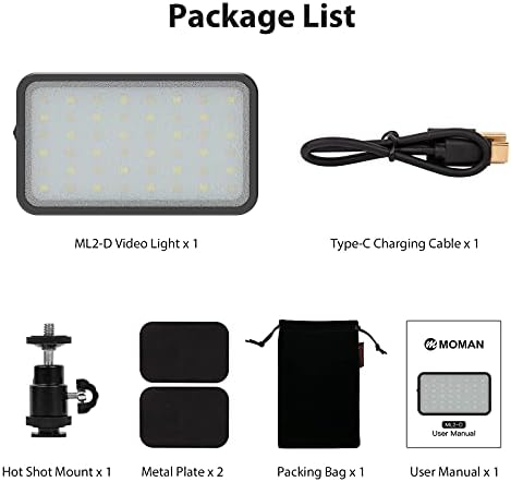 💡【Additional Compact Video Gentle】Solely weighing 110g, Moman ML2-D LED video gentle with 1.5cm thickness as a result of premium plastic panel design can easil y slot in your palm or slip into pocket. Handy and transportable for outside capturing! In-built 2100mAH battery, ML2-D is charged by way of the included Sort-C cable. It helps 90min runtime for 100% brightness after 2.5h full cost.