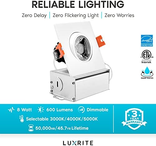 Luxrite 3 Inch Sq. Adjustable LED Gimbal Recessed Lighting with Junction Field, 3 Colour Choices 3000K | 4000K | 5000K, 8W=50W, 600 Lumens, Dimmable Canless LED Downlight, IC Rated, Damp Rated 4-Pack