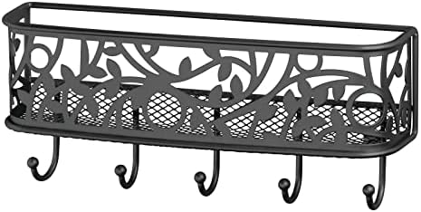 SIMPLE STORAGE: Preserve mudrooms and entryways neat and tidy with this mail station; This sturdy metal wire organizer has one generously sized basket and 5 hooks; Nice for holding and sorting in-going or out-going mail, organizing letters, payments, catalogs, magazines, keys, leashes, hats, umbrellas, equipment and extra; The pure, natural vine design on this organizer will add some fashion to your storage and complement your property decor