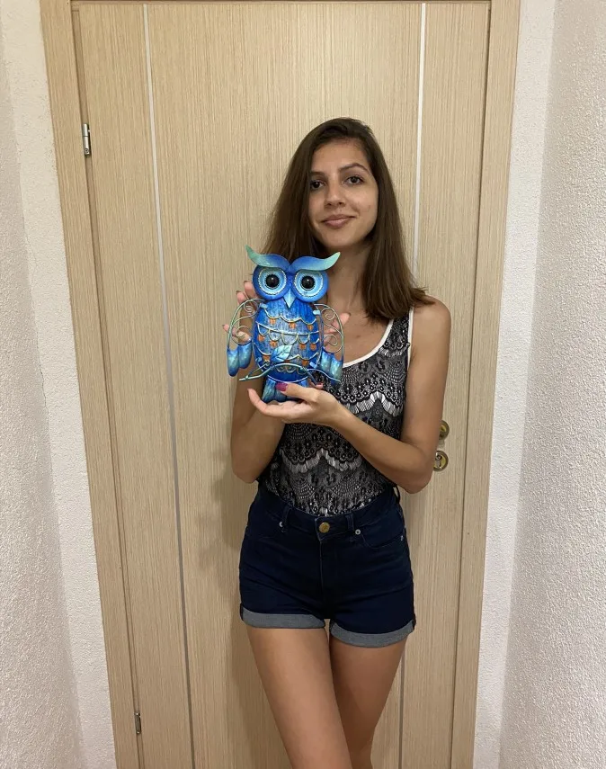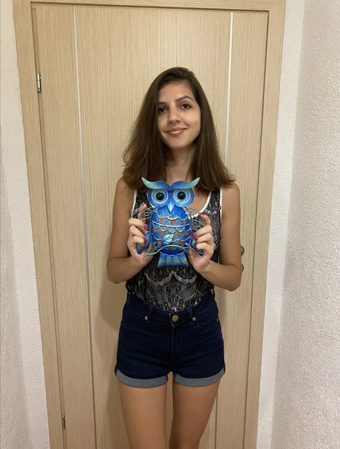 Nice little owl in fine metal, identical to the photo. It measures about fifteen centimeters. Fast and neat shipping, very well packed. I am very satisfied!!