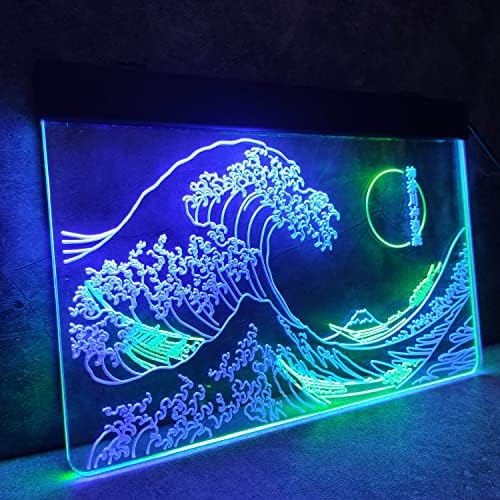 MiMaik The Nice Wave Off Kanagawa LED Neon Signal, Japanese Katsushika Hokusai Signal Basic Room Wall Artwork, Cool Ukiyoe Neon Gentle Indicators for Wall Decor Inside Ornament 12X16 Inches(Blue & Inexperienced)