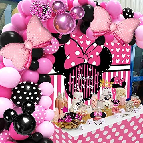 Minnie Mouse Birthday Decorations Celebration Provides for 1st 2nd third 12 months Birthday Pink Woman Child Bathe Ornament Pack (109 Pcs together with Backdrop, Tablecloth, Banner, Cupcake Toppers, Mouse Ear Headband, Foil Minnie and Bow Balloons, Latex Balloons Garland Arch Equipment Set) (Minnie)
