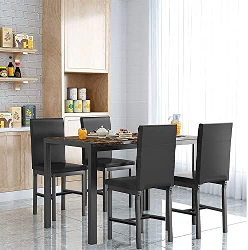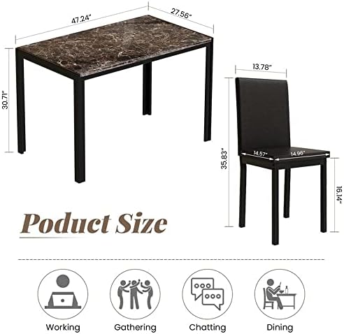 MOOSENG 5 Items Eating Desk Set for 4 Individuals with Fake Marble Desk and 4 Leather-based Chairs, Compact Design for Kitchen, Breakfast Nook, Restaurant, Espresso
