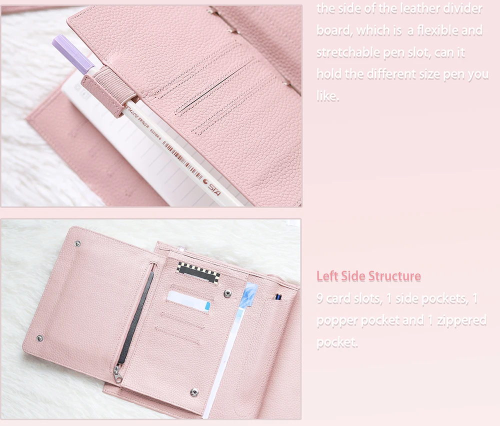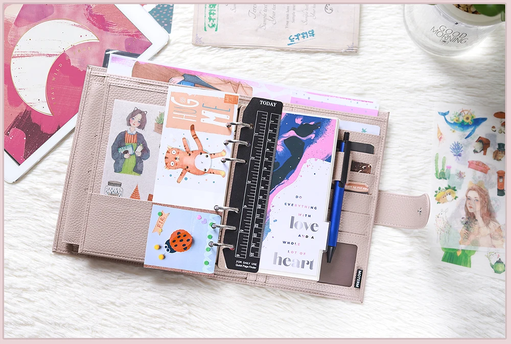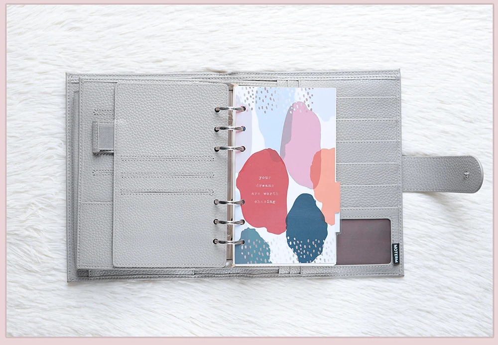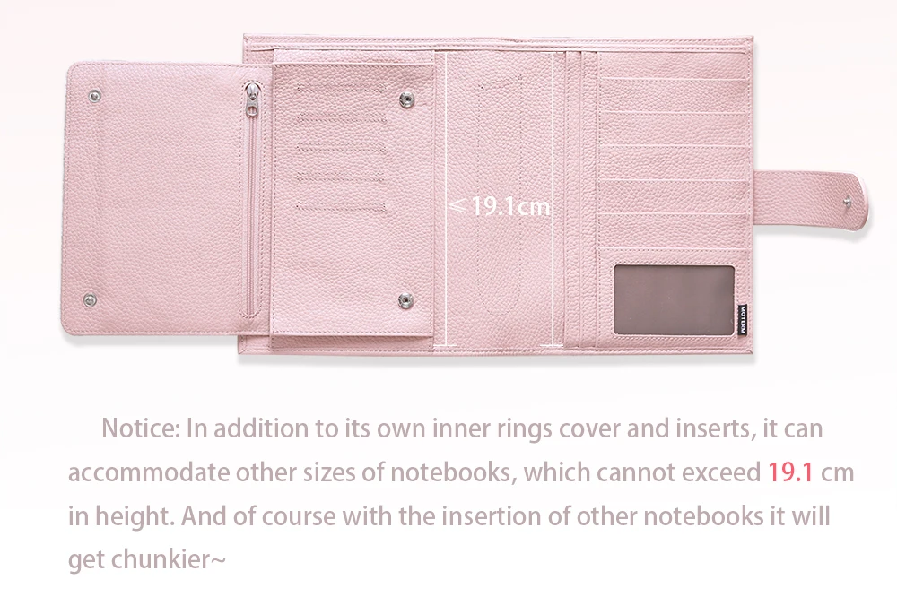This is such a gorgeous planner! Its very soft to the touch and has plenty of pockets! I love that the inner binder is removable and that the pockets fit a b6 notebook! Now i can cary my planner and journal with me! Thank you moterm for the fast and super friendly service and of course amazing and affordable planners!