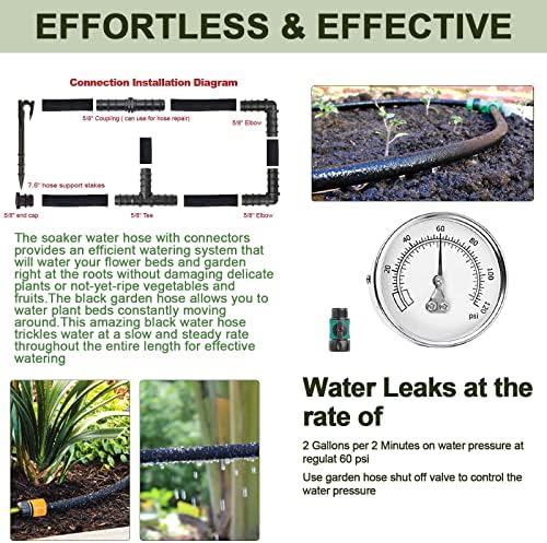 Dimension:100′ X 1/2″ Coloration:Black Bundle Embrace: 1/2in X 100 FT Soaker Hose(with connectors) Clamps *4 3/4″ plastic backyard hose Shut off valve * 1 3/4″ male hose finish adapter * 1 3/4″ finish cap * 2 3/4″ Washer * 2 5/8″ finish cap * 4 5/8″ Tee * 2 5/8″ Coupling * 4 5/8″ Elbow * 2 5/8″ barb X 3/4″ feminine * 1 5/8″ barb X 3/4″ male * 1 7.5″ hose help stakes * 10 zip tie