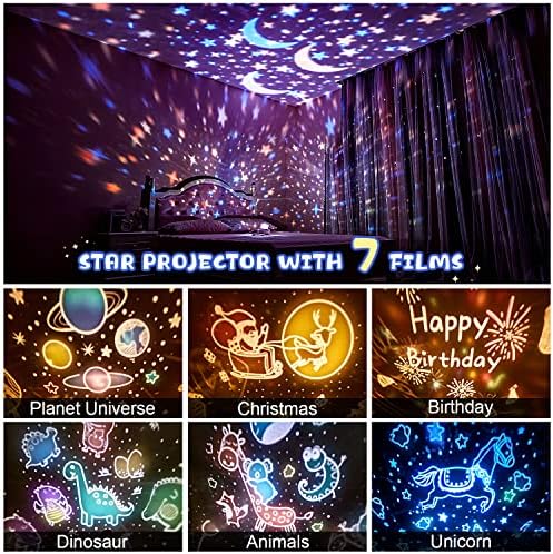 🎨 7 Movies Star Lights for Bed room–Star evening mild projector for youths room decor has 7 movies projection such because the Christmas, Birthday, Dinosaur, Moon Star Gentle,Planet Universe,animals.Children evening mild projector comes with 4 mild colours & 3 brightness & 7 movies,making it a 84 lighting modes evening mild for youths.The star mild projector can 360°rotate for higher projection.The projection mount on ceiling & wall,making a dream-like evening for youths,so it is nice evening lights for youths room.