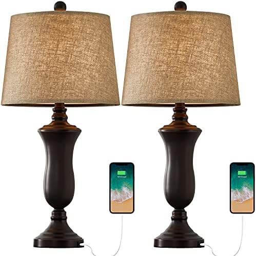 Oneach Trendy Desk Lamps Set of two with USB Port for Residing Room Bed room 25″ Night time Mild Lamp with Material Drum Shade Brown
