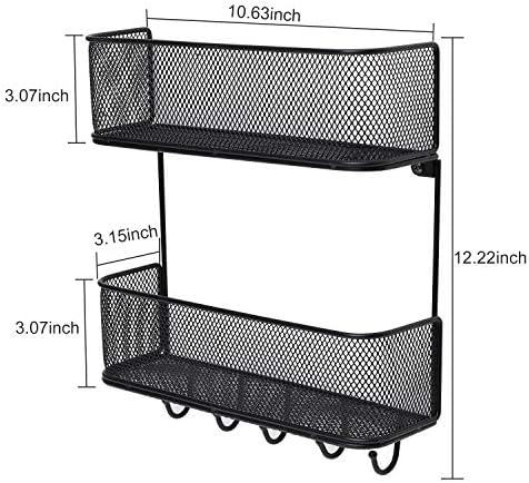 The mail organizer has 2 tiers with 5 key hooks. 2 Baskets is nice for sorting mails, letters, brochures, greeting card, postcard, newspaper, payments, wallets, telephones and extra. 5 backside hooks for key holder, umbrella, canine leash hanging, coat & hat rack. No extra looking for usually used equipment, now you could have a spot for them.