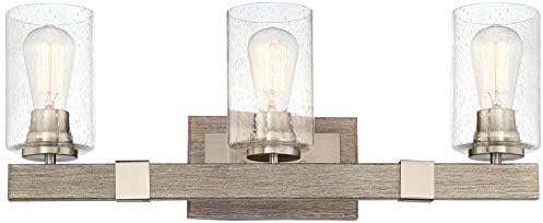 Poetry Farmhouse Industrial Wall Mild Grey Wooden End Grain Brushed Nickel Hardwired 23 1/2″ Broad 3-Mild Fixture Mounted Clear Seedy Glass Toilet Self-importance Mirror Home Dwelling – Franklin Iron Works