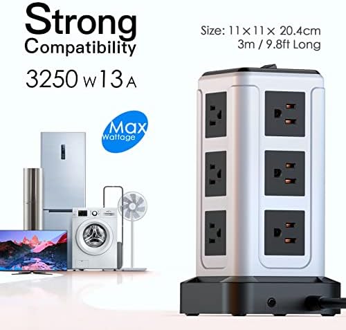 Energy Strip Tower Surge Protector, Outlet Surge Electrical Tower 3250W 13A, 4 Sensible USB Ports, 12 AC Shops and 3M Energy Cable, Charging Station for Telephone, Pill, Energy Financial institution(House/Workplace/Dormitory)