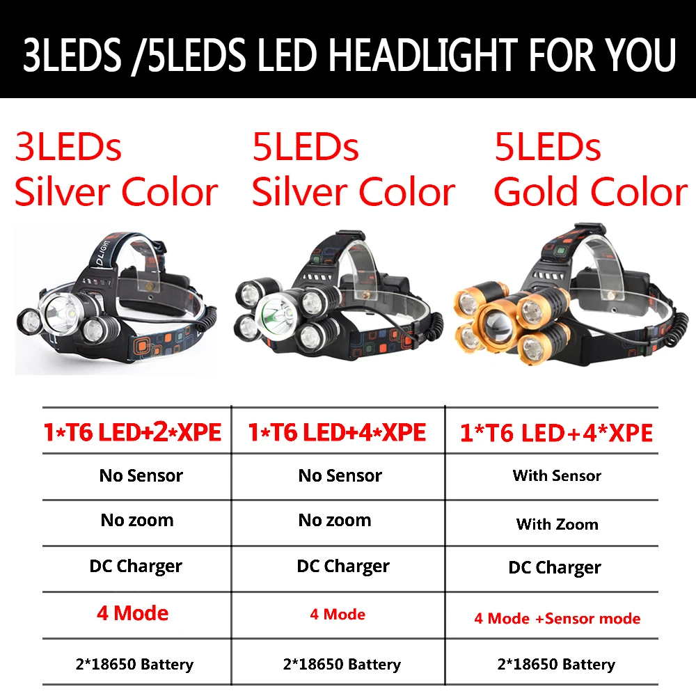 Specification: Highly effective LED Headlamp Fishing Headlight 3/5 LED T6 Head Lamp with Sensor Waterproof Tenting Head Torch Powered By 18650 Battery