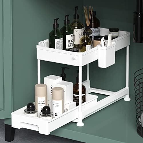 【Sliding Drawer】 This underneath sink organizer is designed with a double layer, maximizing using vertical area. Incorporates a mounted basket and a slide-out basket with a deal with, permitting you to simply take objects. Comes with 4 aspect hooks for hanging some small objects, successfully utilizing the restricted area.