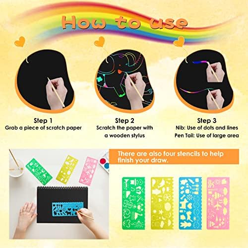 πSimple to Use & Spectacular Artwork: Merely use the styluses to scratch away the black floor movie, revealing the attractive rainbow colours, our craft arts portray equipment additionally comes with 4 various kinds of drawing stencils. It might domesticate and enhance creativeness, creativity, hands-on capability, and contribute to the youngstersβ focus and mental improvement.