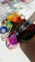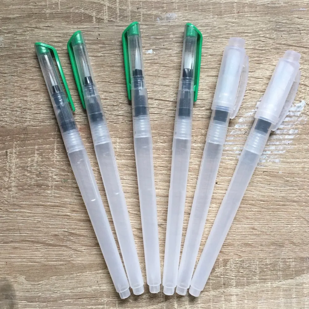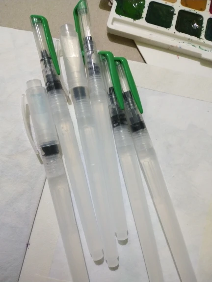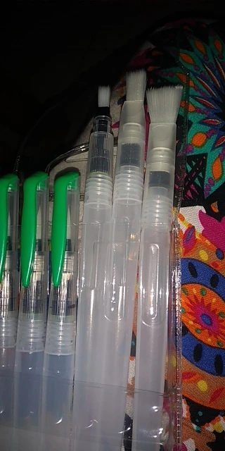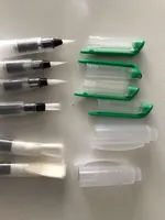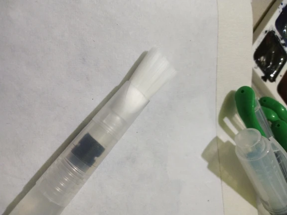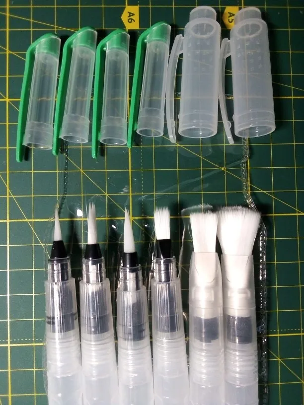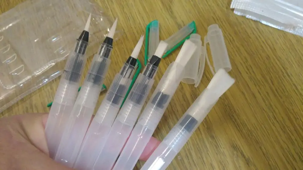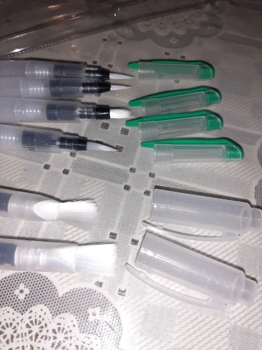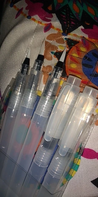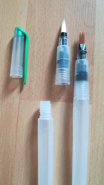 Nice tassels. Water tank made of soft plastic, can be pressed to water droplet poured. Painted with watercolor, it turned out to draw with one brush with different colors. To wash off the color from the brush you need a couple drops to squeeze and spend on unnecessary paper or napkin, perfectly clean will not, but will allow you to type a new color.