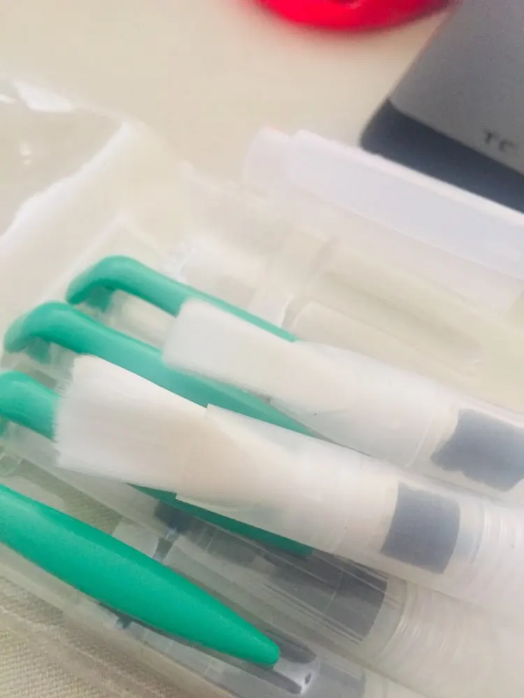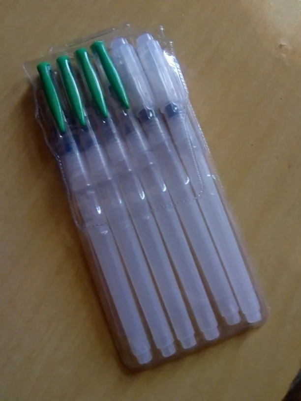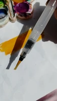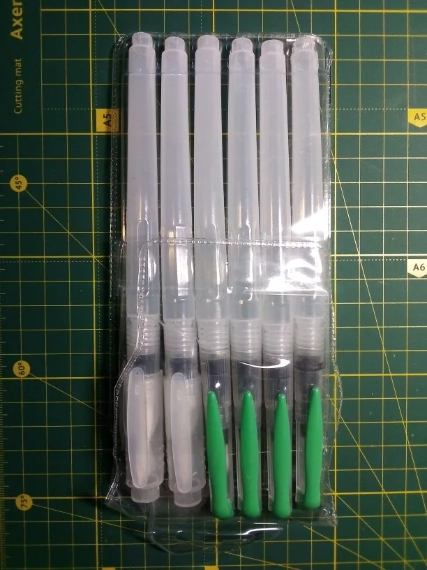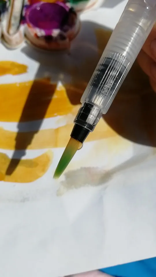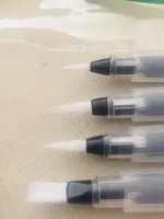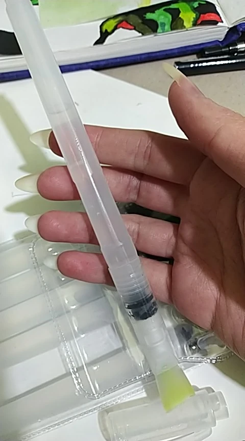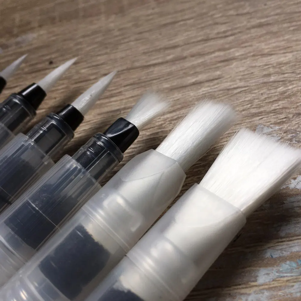 Nice tassels. Water tank made of soft plastic, can be pressed to water droplet poured. Painted with watercolor, it turned out to draw with one brush with different colors. To wash off the color from the brush you need a couple drops to squeeze and spend on unnecessary paper or napkin, perfectly clean will not, but will allow you to type a new color.