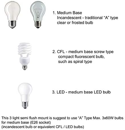 MEDIUM BASE SOCKET: Recommend to takes three most 60 watt Medium base bulbs (incandescent, CFL or LED appropriate). Bulbs not included.