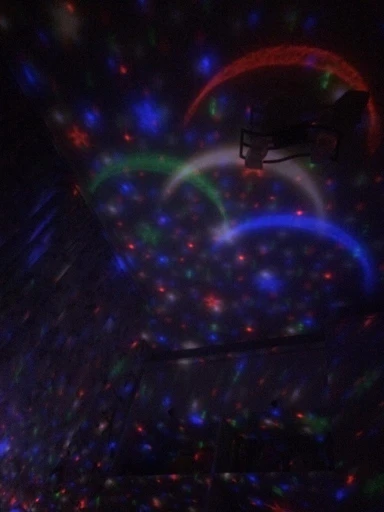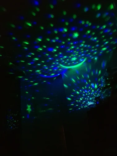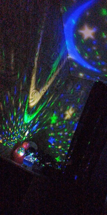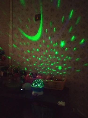 Just super, fire baby delighted, many modes and pure yellow and just green stars and month, and red, and Blue and together, so that they burn and then make up then they do not appear loudly a little bit on crackles when it does not twist straight without noise, this mode can also be turned off, it will not twist. In the kit there is a cord but it works on batteries. But given that I have a child from any rustle kicks up, then the night does not wake up. Up to Voronezh for 2 days, the Courier is tight, the box is whole. If anyone as a gift is a great thing, I did not send it for three days. So very much everything eliminates, and not only the ceiling all the walls have illuminated, it is very beautiful