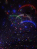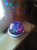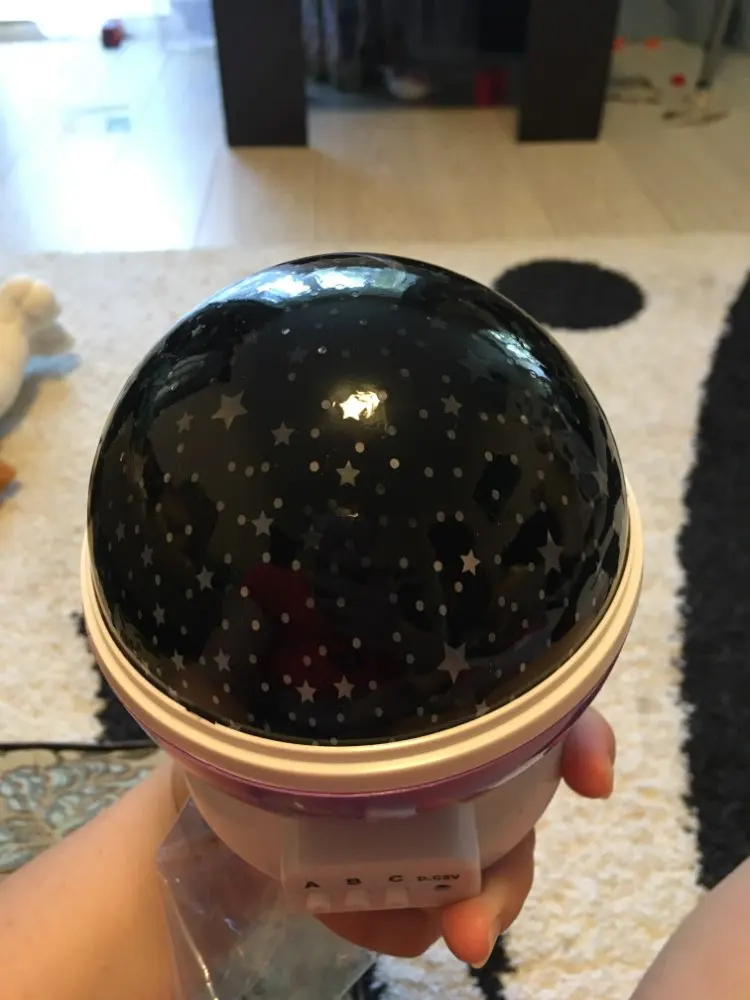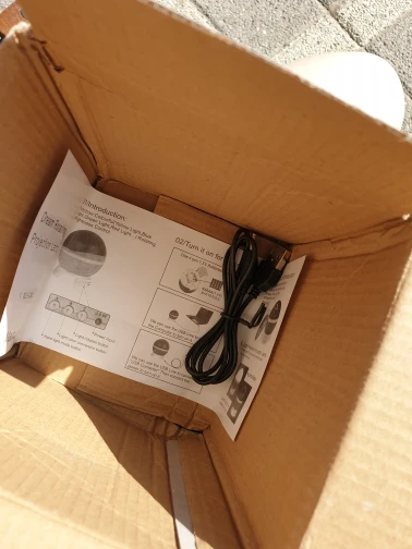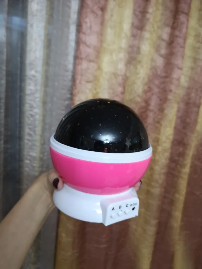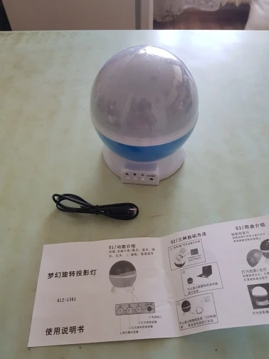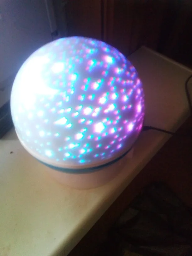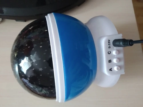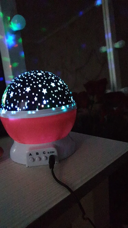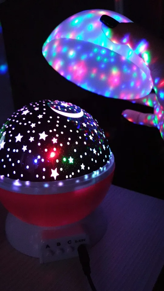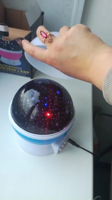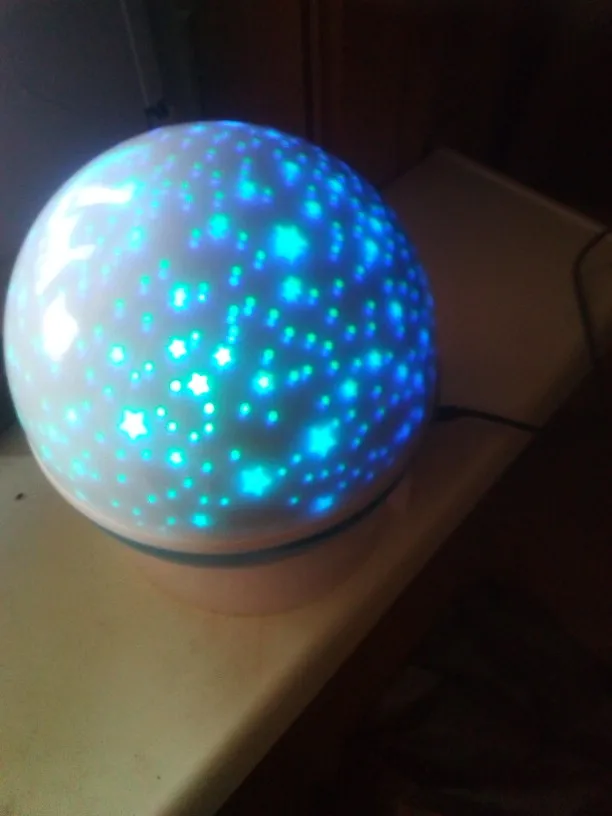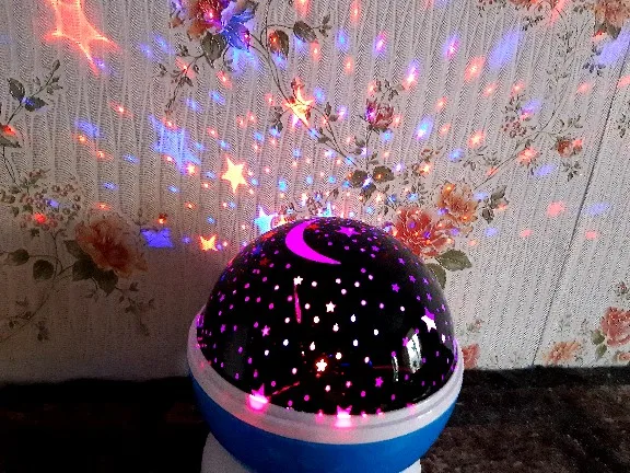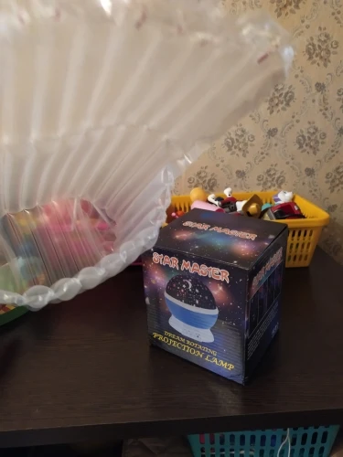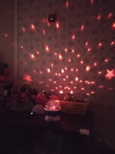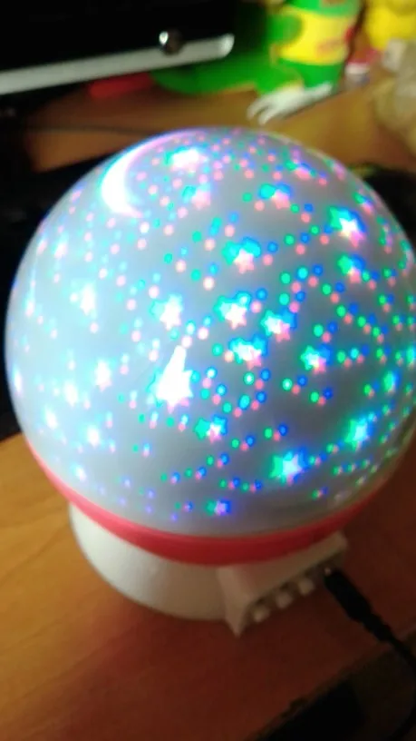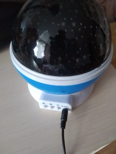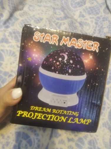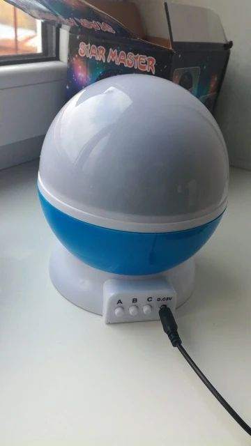 Прекрасный проектор! Шёл полтора месяца, коробка пришла мятая, с самим проектором все хорошо. Домой принёс курьер. Работает и от батареек, и от провода. Если с крышкой использовать – красивый ночник, если без – проектор. Цвет меняется, может вращать звезды, вращает очень тихо. Нам понравилось, а дочери особенно!)