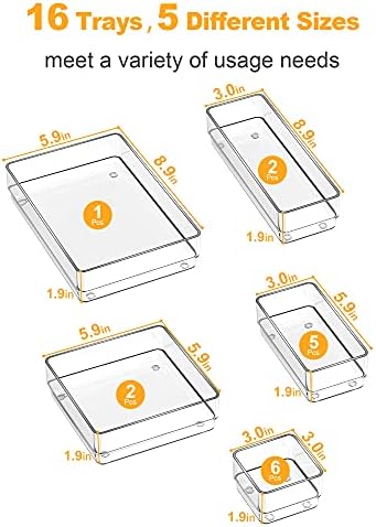 SMARTAKE 16-Piece Drawer Organizer with Non-Slip Silicone Pads, 5-Dimension Desk Drawer Organizer Trays Storage Tray for Make-up, Jewelries, Utensils in Bed room Dresser, Workplace and Kitchen, Clear
