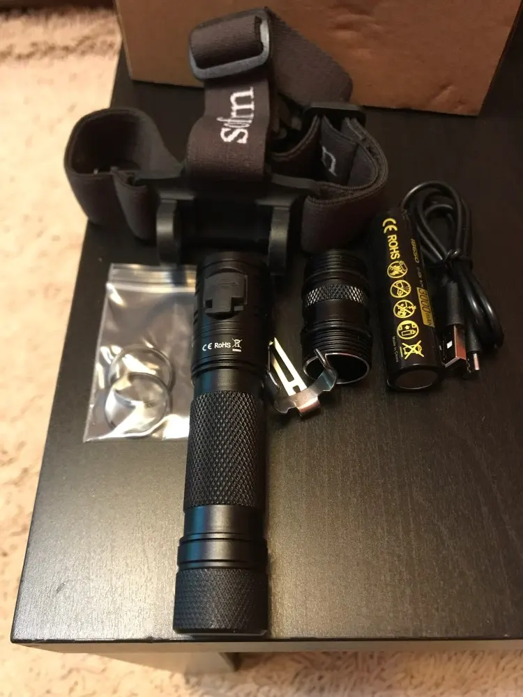 1 headlamp; 1 clip;1 USB cable, 2 exchange O-rings; 1 18350 battery tube; 1 3000mah 18650 battery