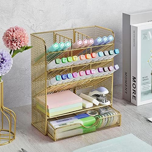 Spacrea Mesh Pen Organizer – Pencil Holder for Desk, Desk Organizer with Drawer for College, Dwelling, Artwork Provides (Gold)