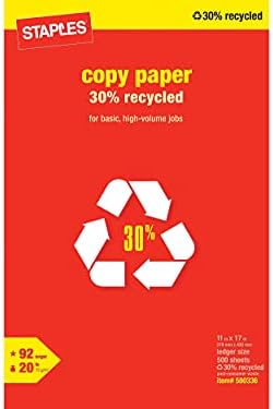 Take an earth-friendly method to printing with this Staples 11 x 17-inch 30 % recycled copy paper. Hold a inventory of this Staples 30 % recycled copy paper available for printing official purposes, court docket paperwork and contracts. The 92 brightness score and white shade make textual content and pictures clearly seen on the web page, whereas the authorized measurement is good for a variety of printing codecs. This Staples 30 % recycled copy paper is good to be used in black-and-white copiers, offering clear, exact outcomes. Dependable copy paper is ideal for on a regular basis use. Paper dimensions: 11″W x 17″L. Paper weight: 20 lbs. Brightness score of 92 for sharp, clear print outcomes. White shade. One ream, 500 sheets whole. Paper is acid-free to forestall from crumbling or yellowing. Incorporates 30% recycled post-consumer content material for a sustainable alternative. FSC certified- this product comes from responsibly managed forests.
