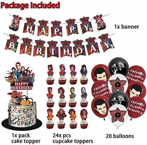 【Excellent Stranger Social gathering Provides Set】Bundle Included 1 pcs completely happy birthday banner,20 pcs latex balloons,1 pcs cake topper,24 pcs cupcake topper. Distinctive character design to make a horror really feel TV themed celebration!