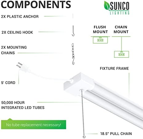 Sunco Lighting LED Store Gentle for Workshop Storage 4FT, Plug in Linkable Utility Gentle Fixtures, 260W=40W, 5000K Daylight, 4100 LM, Frosted Lens, Pull Chain, Hanging/Mounted, ETL, Power Star