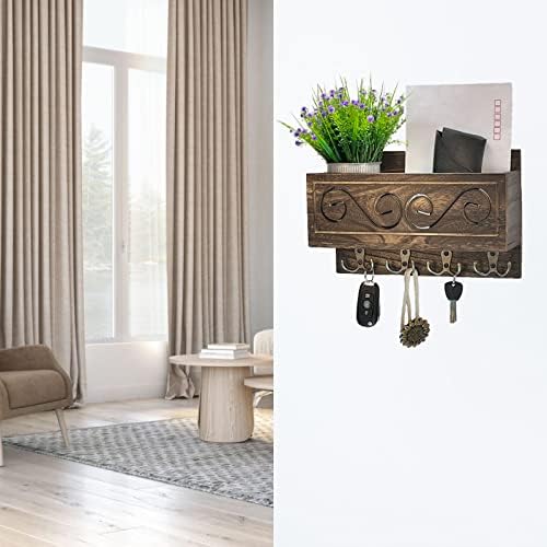 SVENJBB Mail Organizer Wall Mount, Mail Holder with Ornamental Potted Synthetic Flowers and 4 Double Key Hooks, Rustic Wooden Key Holder for Wall, Entryway and Mudroom, 11.5 ” W x 7.5″ H x 4.2″ D