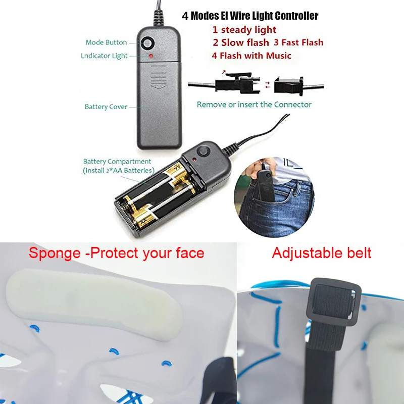 Specification: Ten Colors EL Wire Gentle Masks Halloween Scary Masks LED Costume Masks Cosplay Get together Efficiency Battery EL Wire Gentle Masks Q30