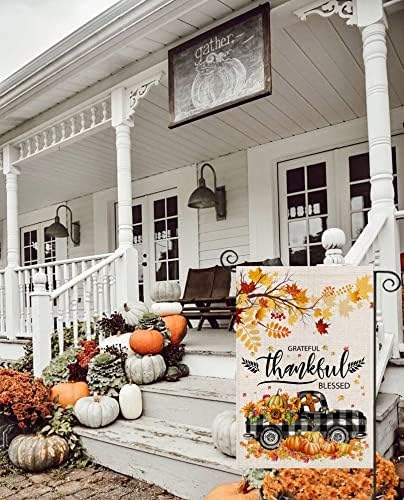 Thanksgiving Fall Backyard Flag 12×18 Double Sided,Grateful Grateful Blessed Buffalo Plaid Truck with Pumpkins Maple Leaves Yard Flags for Exterior,Small Seasonal Decor for Autumn Vacation Farmhouse Out of doors
