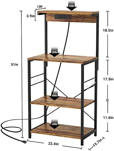 Topfurny Baker’s Rack with Energy Outlet, Kitchen Microwave Stand, 4 Tiers Kitchen Storage Rack Espresso Bar Desk with 5 Hooks, Kitchen Organizer Cabinets for Spices, Pots and Pans, Rustic Brown