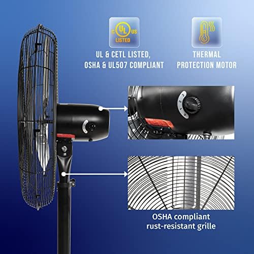 Constituted of sturdy aluminum and powder coated metal building, rust-resistant grille. Premium Completely Enclosed Air Over (TEAO) ball bearing motor. Additional-long 6.6 FT SJT energy twine. 1.3 AMPS, 1100 RPM, 7700 CFM, 120V, 170 Watts, 60 Hz, 1/5 HP. Meets OSHA and UL507 requirements, UL Security listed. 1 Yr Restricted Guarantee.