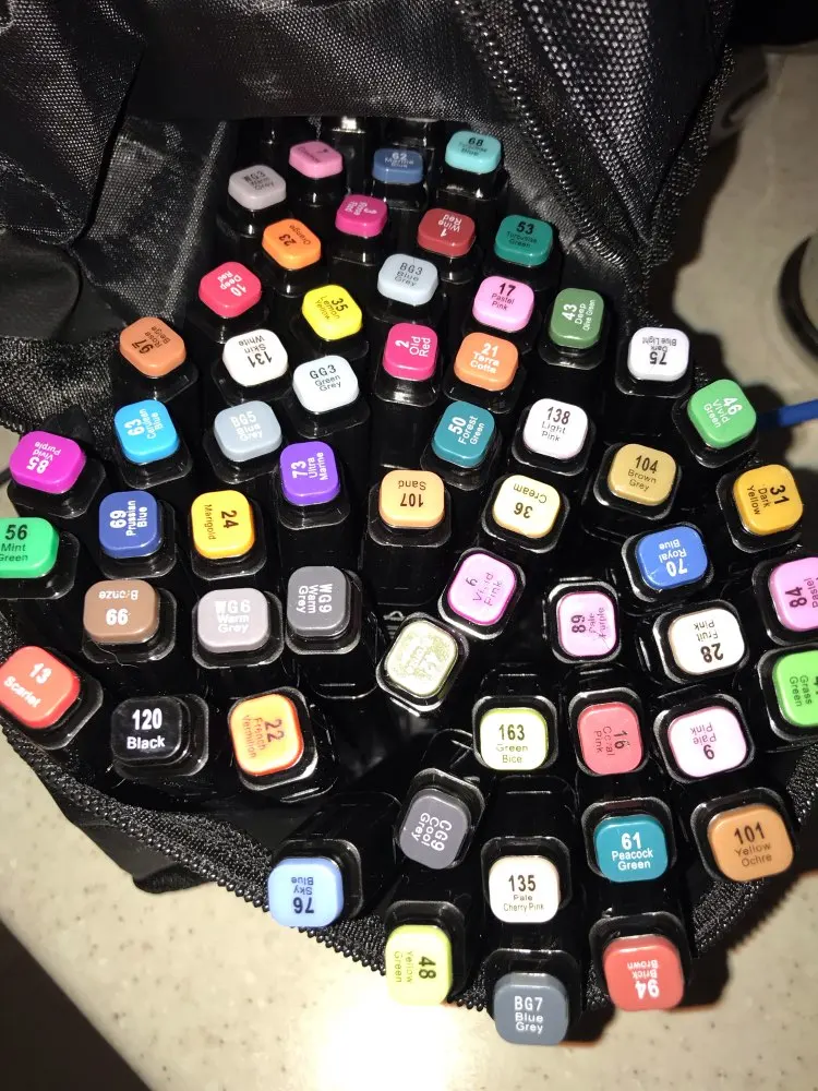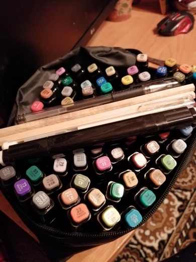 Markers arrived 5 days earlier, were in a bag, and the bag is tightly packed in a box and sealed from all sides. The colors are slightly different from the caps, so it is better to make the paint first, to know the shades and do not shoe accidentally too dark. All markers are fresh, write wonderful, also in the parcel were put gifts (Blender, double-sided liner, white gel pen and two simple pencils). The bag by the way is also very good. Many thanks to the seller: 3