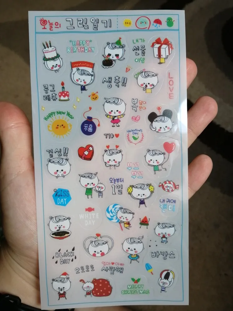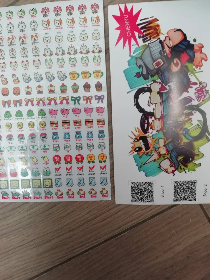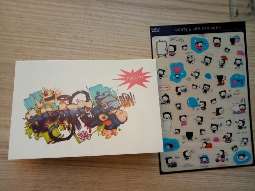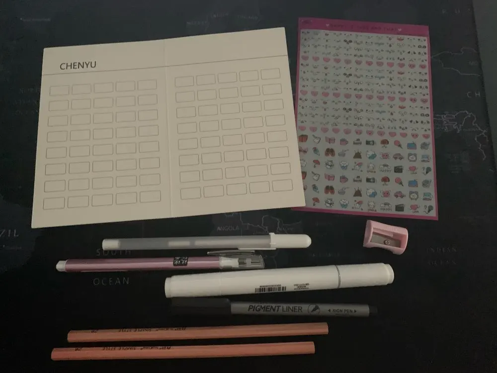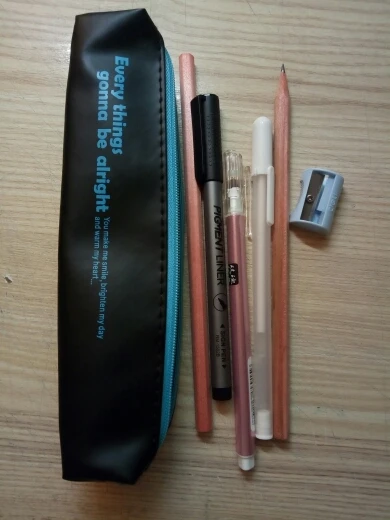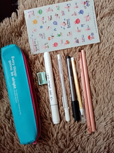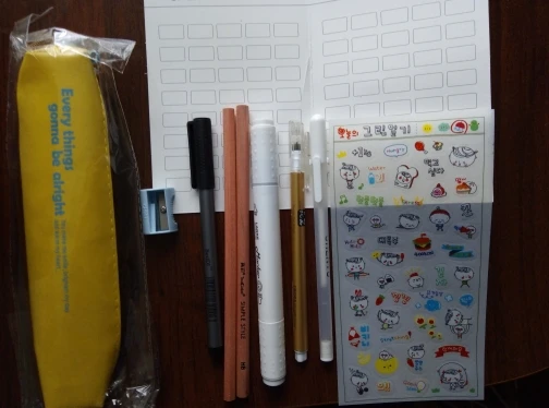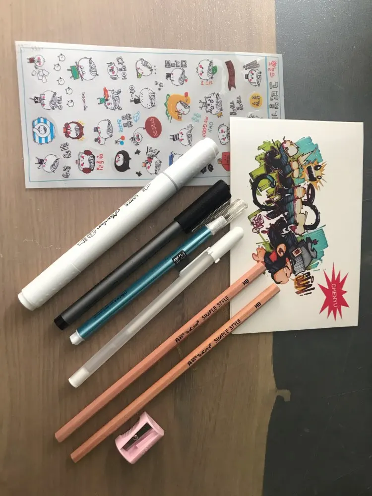 The seller put the gifts-liner, pen, two pencils, sharpener, stickers, marker for mixing and white pen.