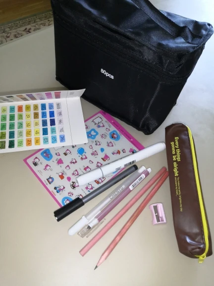 Excellent markers came from China to the post office in a couple of weeks. Everyone draws, shades sometimes do not match (only 2 markers). Some have leaked, most likely because of new ones. The quantity is exactly the same as a gift went pencil case, stickers, 2 pencils, white pen, black pen and liner.