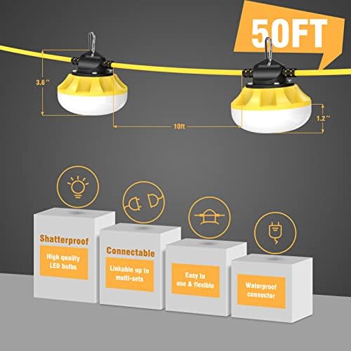 TUNTDIE 50FT Building Lights Army Grade Shatterproof Led Work Lights for Building, Storage, Patio, Renovation, Mine cave and Different Outside Building String Lights with 5 Hanging Hooks