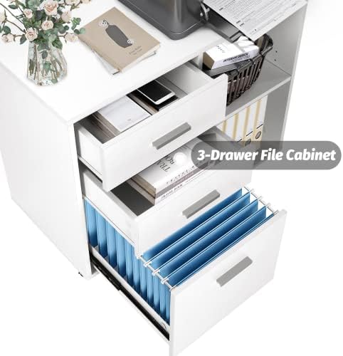 TUSY 3-Drawer Wooden File Cupboard, Cellular Lateral Submitting Cupboard with Rolling Wheel, Printer Stand with Open Storage Cabinets for House Workplace, White