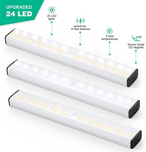 Beneath Cupboard Lights,2 Pack 24 LEDs Movement Sensor Gentle Indoor,Dimmable 3 Colour Temperature Closet Gentle,Wi-fi Rechargeable Beneath Cupboard Lighting,Battery Powered Night time Gentle for Kitchen, Closet